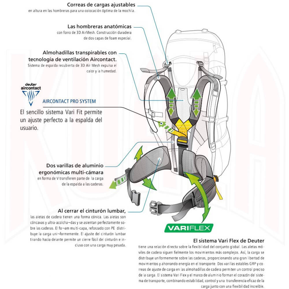 Mochila de gran capacidad AIRCONTACT PRO Deuter diseñada para actividades de varios días en actividades de Trekking exigentes de largo recorrido. Con espalda Vario Quick System: ventilada y ajuste ergonómico clásico Aircontact System regulable en altura. Incluye una mochila Day Pack.