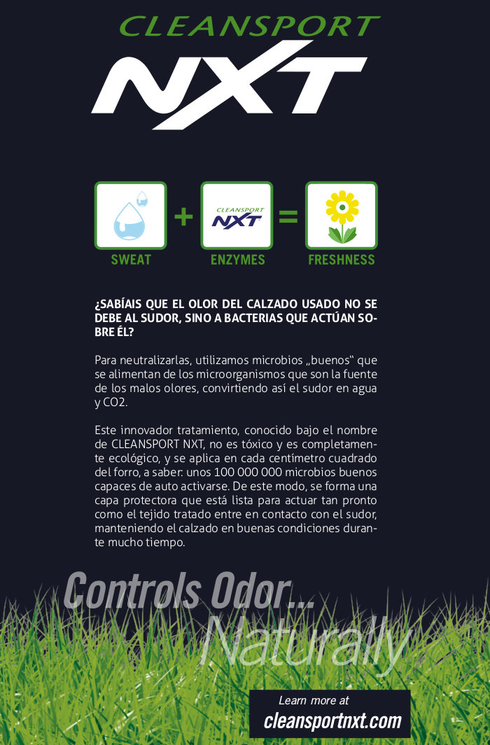 - Cleansport ha patentado un método para adaptar CLEANSPORT NXT a superficies y adherimos 100.000.000 microbios a cadat pulgada cuadrada de tela. Esto crea un acabado proactivo que está listo para funcionar tan pronto como nuestra tela sometida a tratamiento entra en contacto con el sudor o cualquier otro material orgánico.